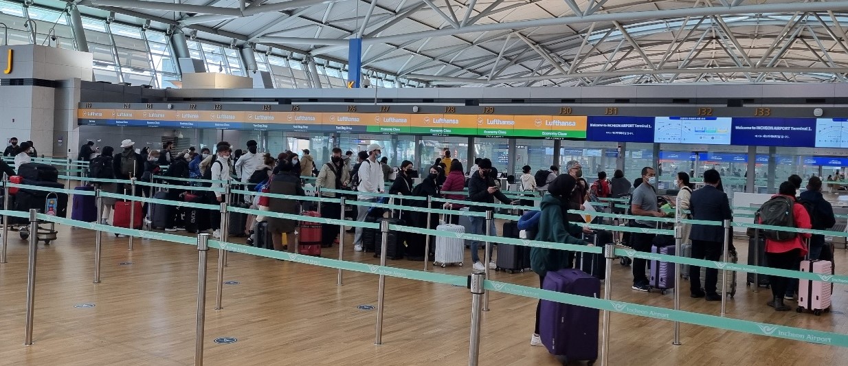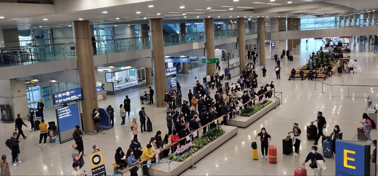 코로나19 규제가 풀리면서 썰렁했던 출·입국장에 여객들의 발길이 늘어 인천공항도 다시 활기를 띠고 있다. 10월 하루 이용객은 7∼8만명으로, 코로나19 이전인 2019년 20만명에 비하면 아직도 40%가 되지 않는다. 인천국제공항공사는 방학 등 동계 항공 성수기에는 50% 수준으로 회복될 것으로 예상하고 있다.