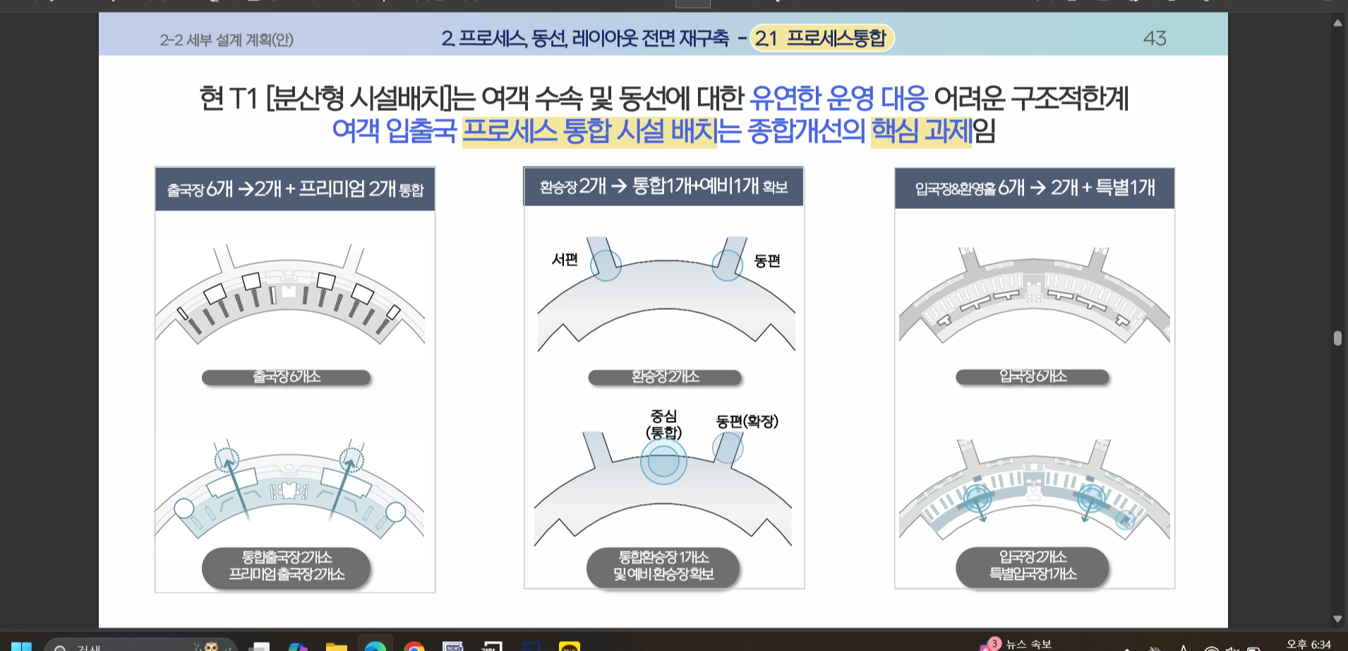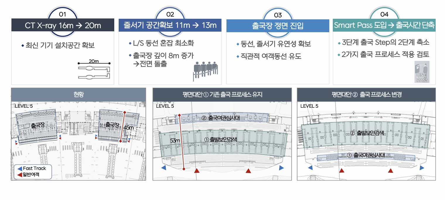 특히 3층에 있는 출국장 6개는 4개로 통합된다. 중앙에 있는 출국장 4개를 2개의 통합출국장으로 만들고, 동·서측 끝단에 2개의 프리미엄 출국장을 조성한다. 보안구역 내 동·서편의 환승장도 1개의 환승장으로 통합하고, 1개는 예비로 신설한다.