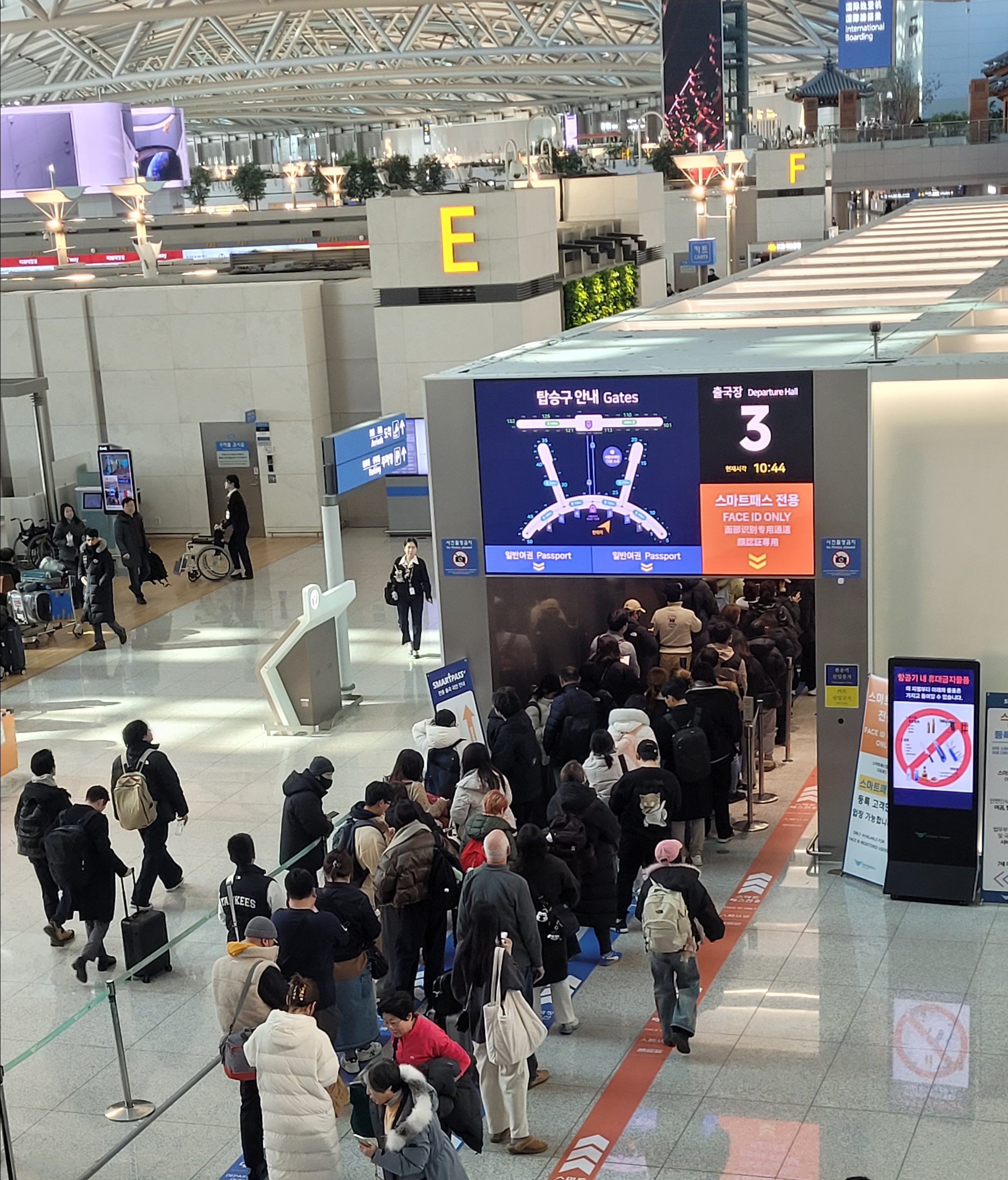설 연휴를 맞아 A씨는 가족과 함께 지난달 27일 오전 9시에 일본 도쿄로 출발하는 항공기를 타기 위해 인천공항에 3시간 전인 오전 6시에 도착했다. 출국수속에만 1시간 이상이 걸렸고, 안면인식으로 탑승권과 여권을 보여주지 않아도 되는 스마트패스에 등록했지만 긴 줄은 여전해 무용지물이었다. A씨는 줄서기에 지친 데다 탑승시간도 빠듯해 면세쇼핑도 못하고 간단히 식사만 한 뒤 비행기에 올랐다. A씨는 “이제 인천공항에서 비행기를 타려면 4시간 전에는 도착해야 할 것 같다”고 말했다.