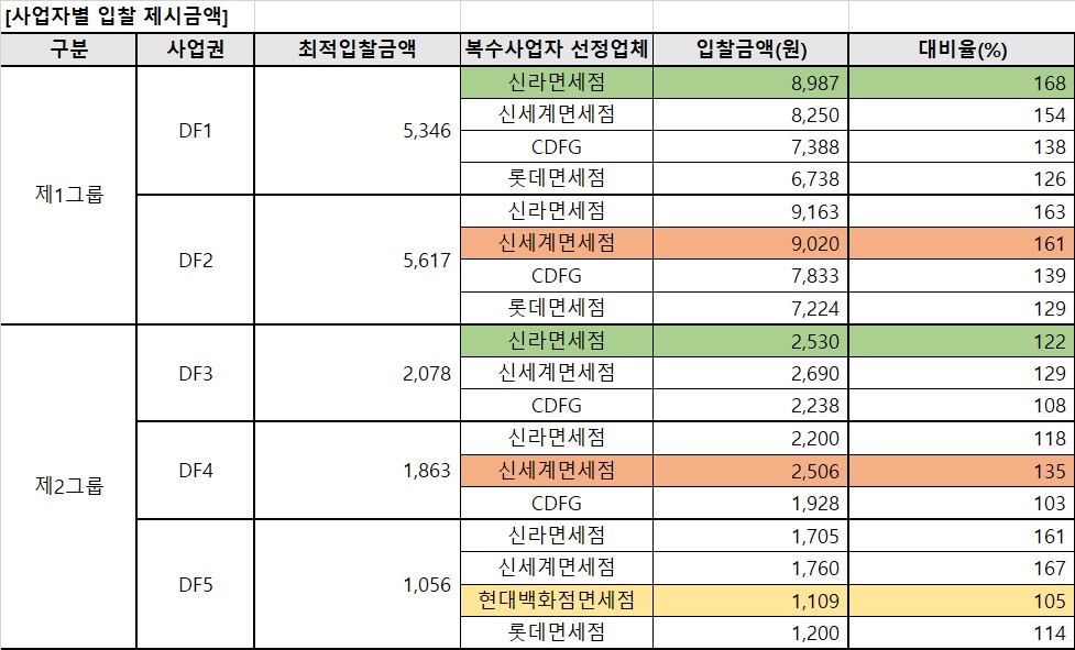 2023년 인천공항 면세점 입찰 당시 각 사업자별 제시금액