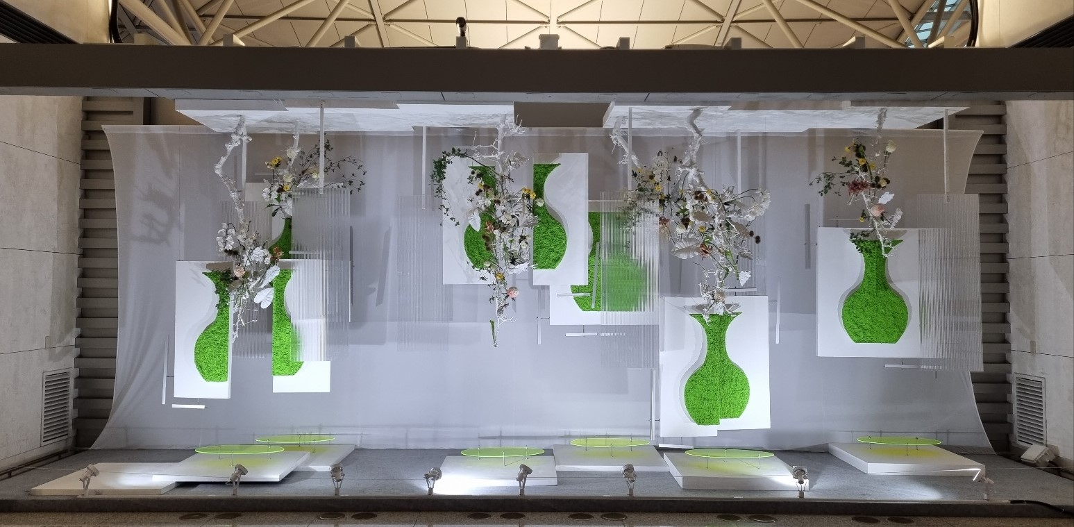 이 작품은 꽃이 화병 속의 자양분으로 아름다운 꽃을 피워내듯이 공항에서 시작되는 각각의 여정과 순간들이 자양분이 되어 우리 삶을 풍요롭게 만들어 낸다는 의미를 담아 다양한 꽃과 화병형태로 연출했다.