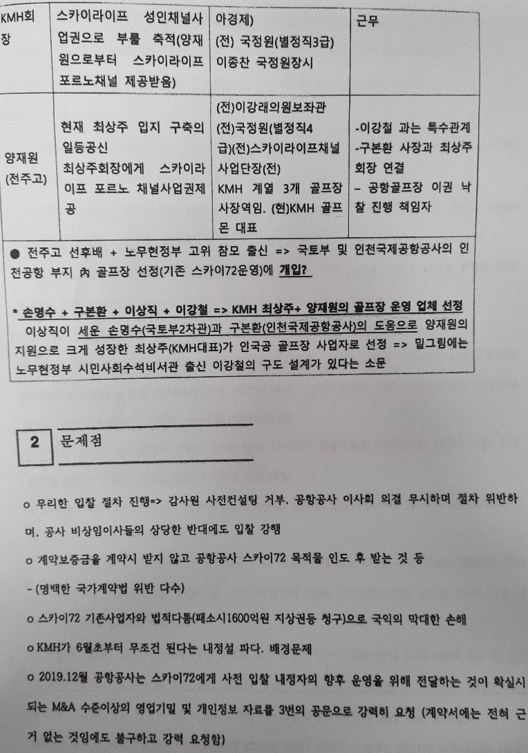 이뿐만이 아니다. 인천지역 시민단체인 인천평화복지연대는 이 문건을 토대로 인천국제공항공사가 특정업체에게 스카이72 골프장 운영권을 주기 위해 ‘기획입찰’ 의혹이 있다며 감사원에 공익감사를 청구했다.