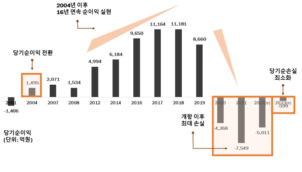 2004년부터 16년째 이어오던 흑자행진은 ‘코로나19’ 한 방에 적자로 돌아섰다. 2020년엔 4268억원, 2021년은 7549억원의 적자에 이어 올해도 5011억원의 적자가 예상된다. 내년에는 적자폭이 감소한 599억원으로 예상된다.