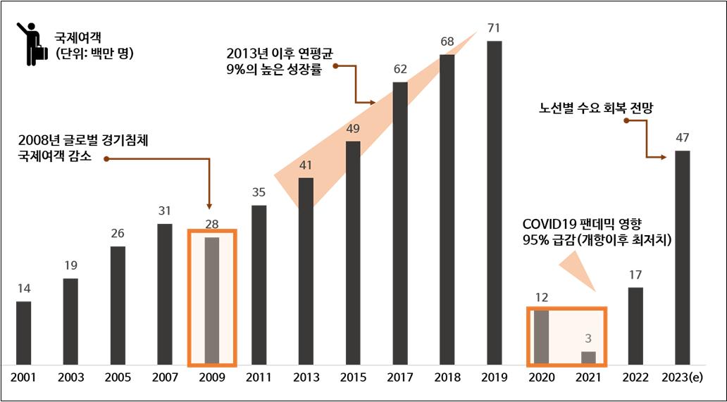 공항산업기술연구원은 “코로나19 규제 완화로 노선별 수요 회복세를 보이고 있지만, 중국을 비롯한 주변국의 보수적 방역정책이 여전히 회복 한계 요인으로 작용하고 있다”며 “펜데믹 이전 수준으로 회복하려면 2025년이 돼야 할 것 같다”고 말했다.