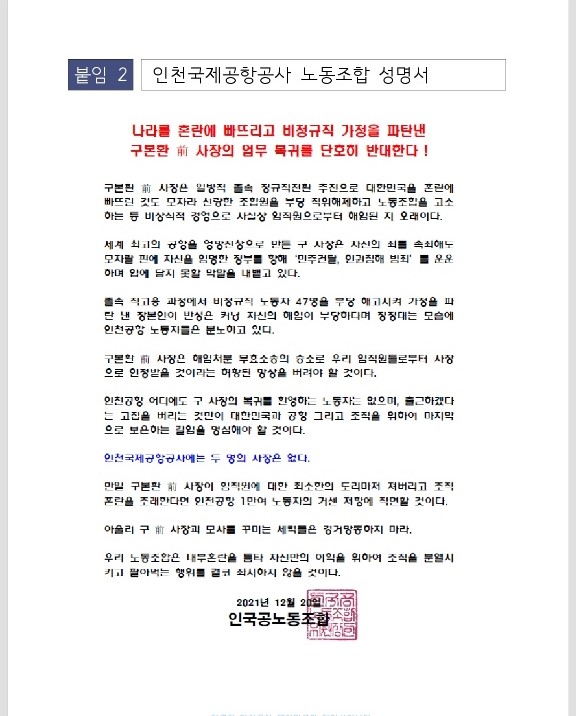 인천국제공항공사 노조도 ‘나라를 혼란에 빠뜨리고 비정규직 가정을 파탄낸 구 전 사장의 업무 복귀를 단호히 반대한다’는 성명서를 발표했다.