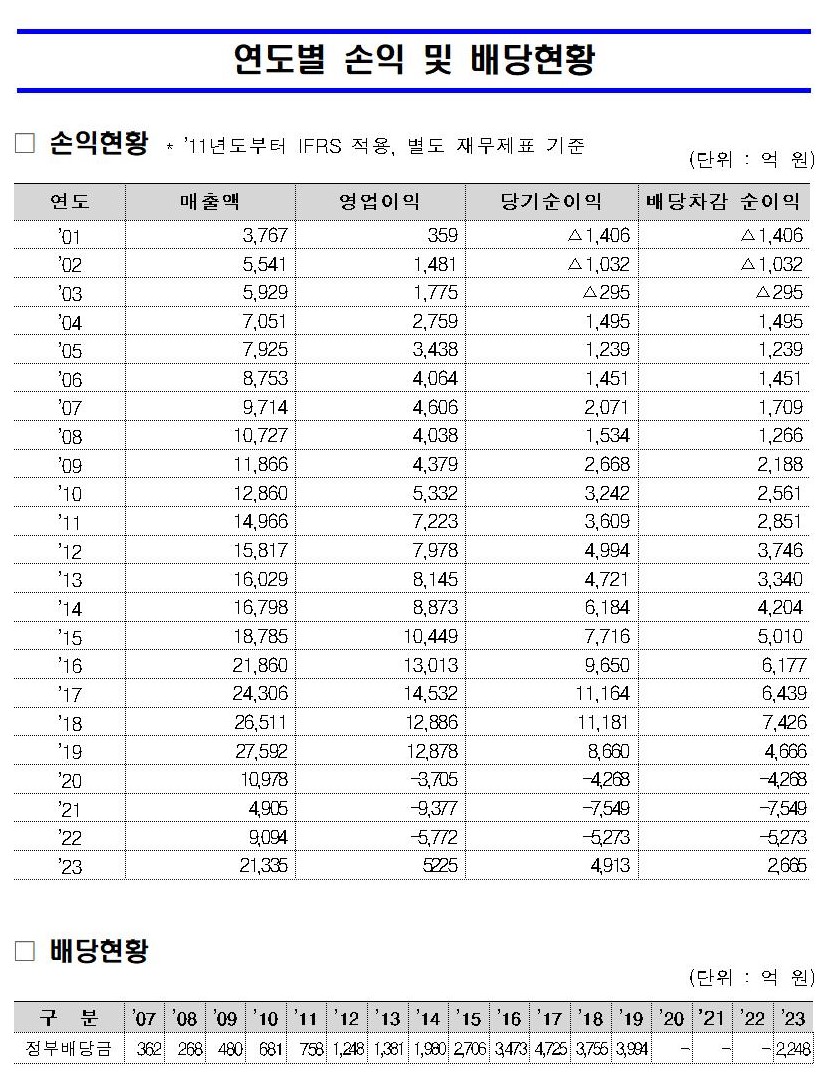 2. 인천공항공사는 다른 공공기관보다 더 심하게 코로나19의 직격탄은 맞은 곳이다. 인천공항공사는 코로나19가 시작된 후 2020년 4,268억 원, 2021년 7,549억 원, 2022년 5,273억 원의 적자를 냈다. 그러다가 작년에 전 세계적으로 해외여행이 코로나19 이전 수준을 회복하면서 흑자로 돌아서 4,913억 원의 수익을 냈다. 정부는 인천공항공사가 흑자를 내자마자 기다렸다는 듯이 전체 당기순이익 중 배당금으로 코로나 이전 7년 동안 평균인 36%보다 10%나 많은 전체 당기순이익 중 46% (2,248억 원)을 가져가 버렸다. 그동안 정부가 챙겨간 배당금 규모는 2조 7,090억 원이나 된다.