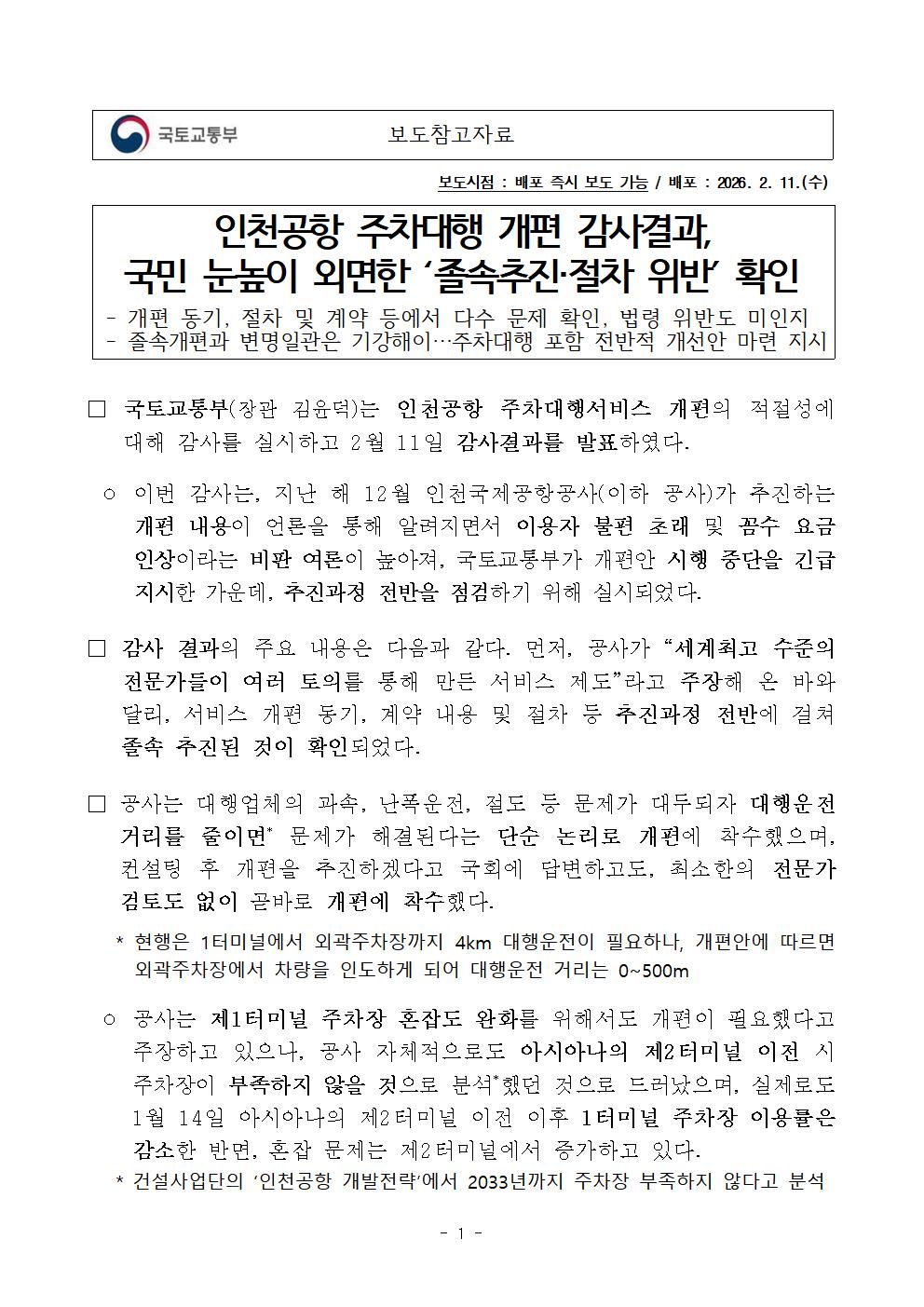 인천공항 제1여객터미널 주차 개편에 대해 특정감사를 벌인 국토교통부가 지난 11일 감사결과를 발표했다.