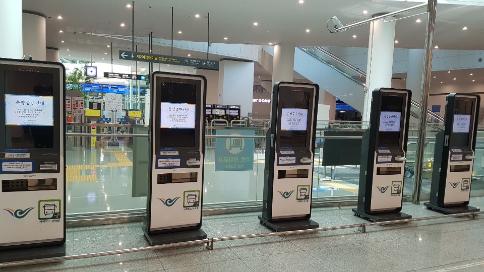 3층 출국장은 해외 여행에 들뜬 탑승객들이 짐을 끌고 다니며 북적이던 때가 언제인냐는 듯 썰렁하다. 햄버거 집과 도서 판매장 등 상업시설들도 셔터를 내렸다. 셔터에는 “코로나19가 종료될까지 매장 운영을 중단한다‘는 안내문을 붙여놨다.