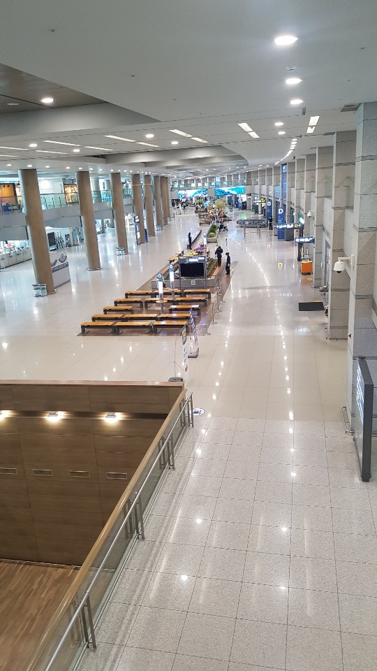 제1·2터미널 입·출국장은 한 마디로 ‘횡∼하다’. 1층 입국장은 마스크와 하얀 방호복을 입고 도착객을 선별진료소나 지역별로 운행되는 안심버스로 안내하는 공무원들만 눈에 띈다.