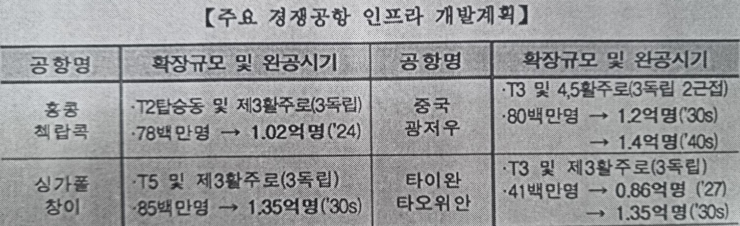 인천공항 주변 공항들도 세계 공항시장 선점을 위해 대규모 개발에 나서는 등 갈수록 경쟁은 격화되고 있다. 홍콩 첵랍콕은 2024년 1억200만명, 중국 광저우는 2030년 1억2000만명, 싱가포르 창이도 1억3500만명으로 확장사업을 벌이고 있다.